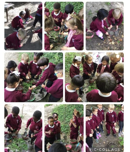 Using different resources, some children made Spring pictures in the sunshine.