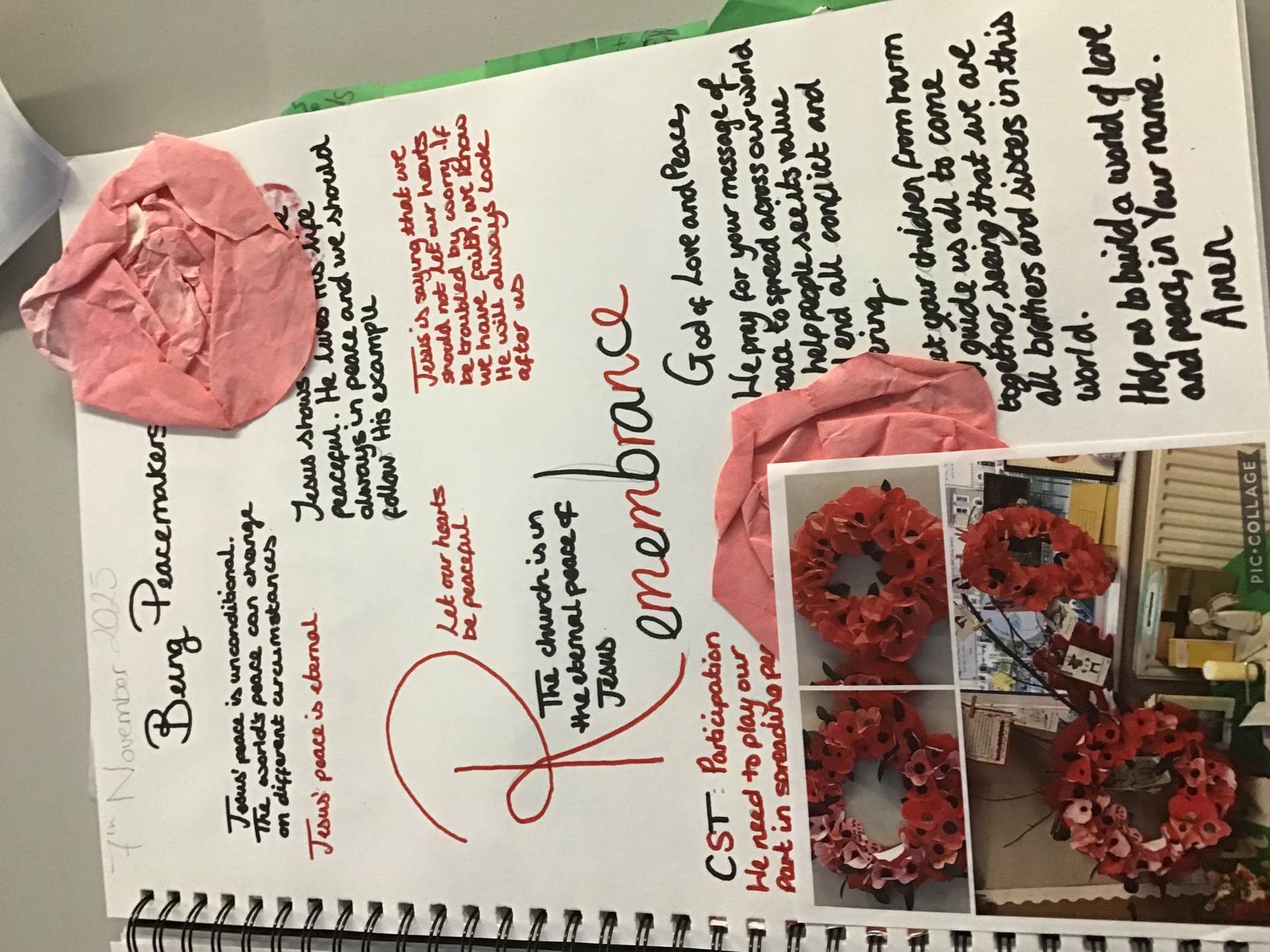 As part of our Remembrance Day celebrations, we thought about the meaning of John 14:27. We discussed how Jesus came to give us peace and showed us the way to be peaceful. The class created a prayer: