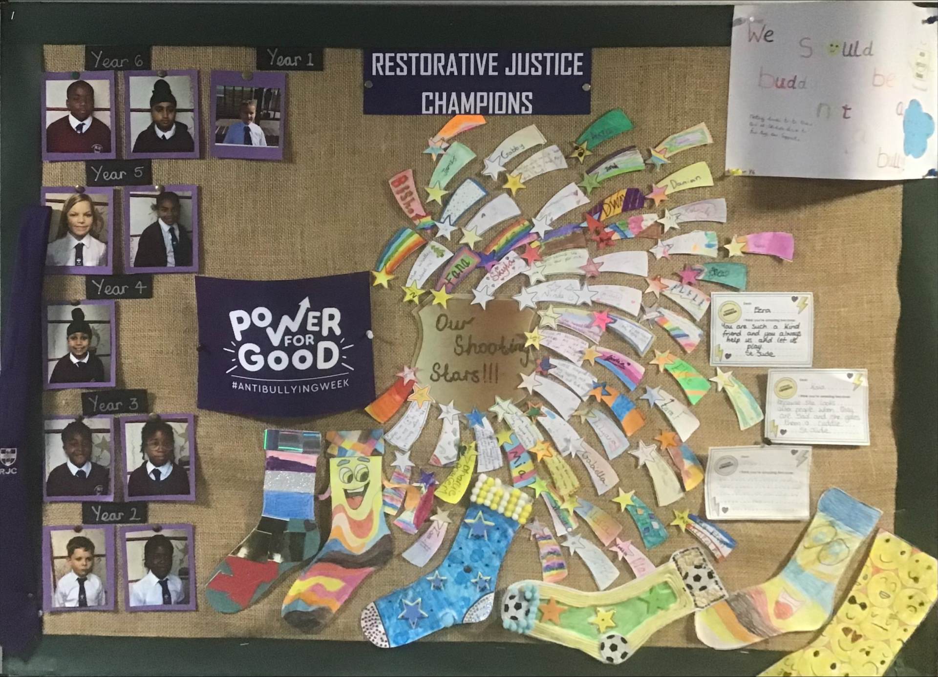This year, the champions are focusing on Power for Good. To begin, a team meeting was held to educate the children about their roles as RJCs. The children were provided with resources to hand out to a classmate once a week to celebrate someone who has shown kindness and respect to them. The shooting stars will be displayed on the RJC board.